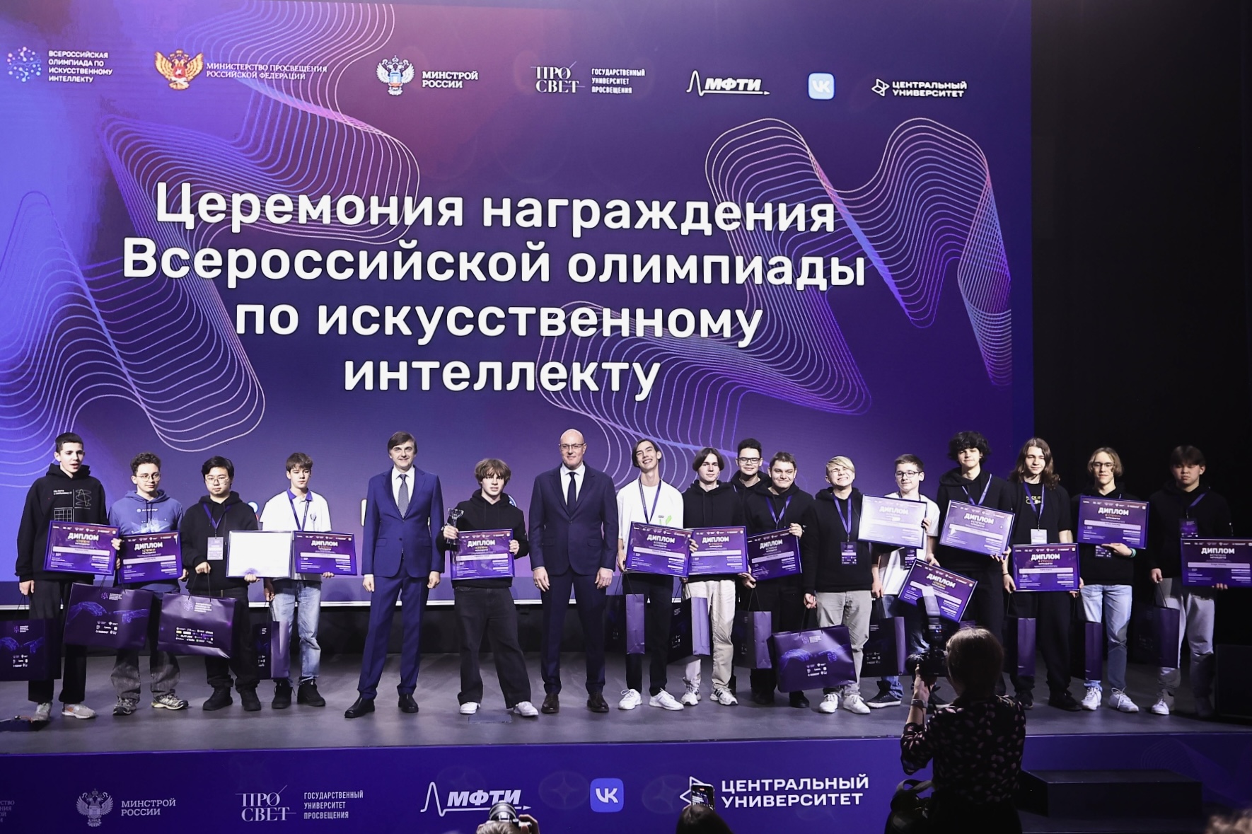 14 победителей и призёров олимпиады из Новосибирской, Ростовской, Орловской, Московской областей, Удмуртии, Краснодарского края, Санкт-Петербурга, Москвы и Казахстана наградили заместитель председателя правительства РФ Дмитрий Чернышенко и министр просвещения РФ Сергей Кравцов.
